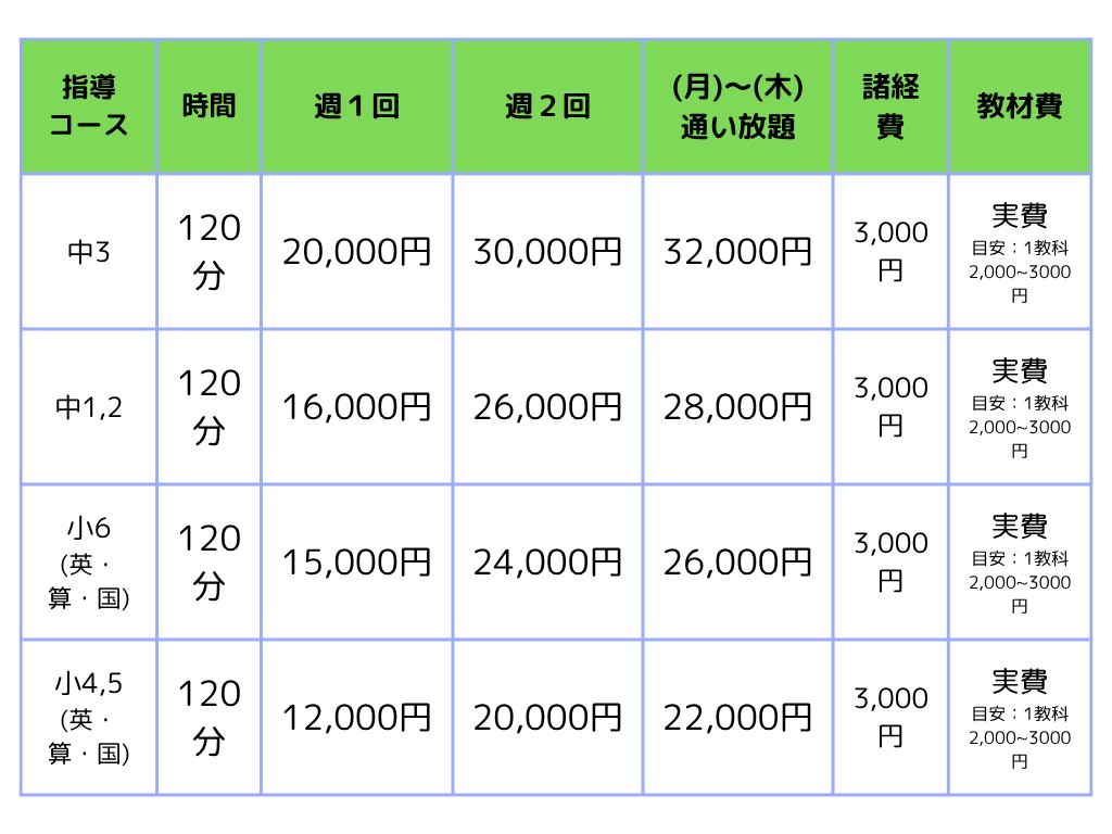 【 個別指導コース:料金表 】